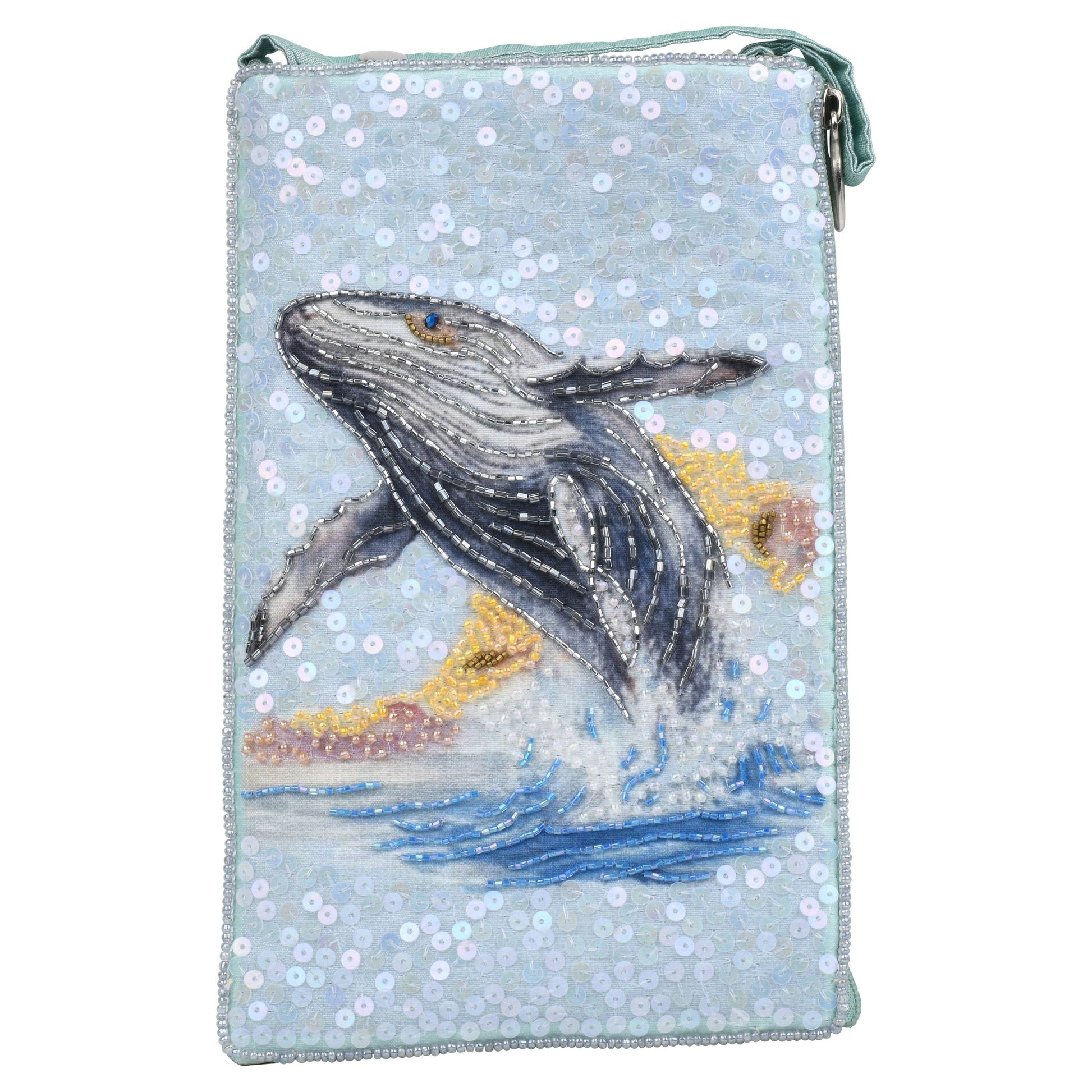 Make a splash with this stunning beaded clutch featuring a majestic humpback whale leaping from the ocean waves. Intricately hand-beaded with shimmering sequins, bold beadwork, and soft pastel tones, the design captures both the power and grace of the whale. Accented with sparkling sequins on a sea-blue background, this versatile clutch adds coastal charm and a touch of elegance to any outfit.