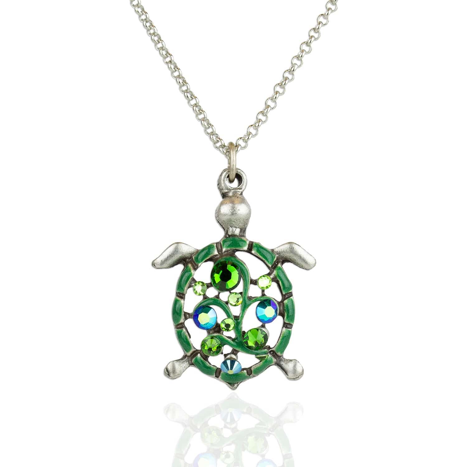 Drift away with the cool sparkle in this delicate sea turtle pendant. Featuring a hand enameled open shell with scroll metal details and brilliant crystal accents, this necklace will feel like gliding through calm waters. Made in the USA with lead/nickel free antiqued silver plated white metal castings and rolo chain. Lobster claw closure. Crystal Colors: shades of green, iridescent emerald Enamel Color: green Measures Approximately: Pendant 1 1/8″ L x 3/4″ W; Chain 16-18″