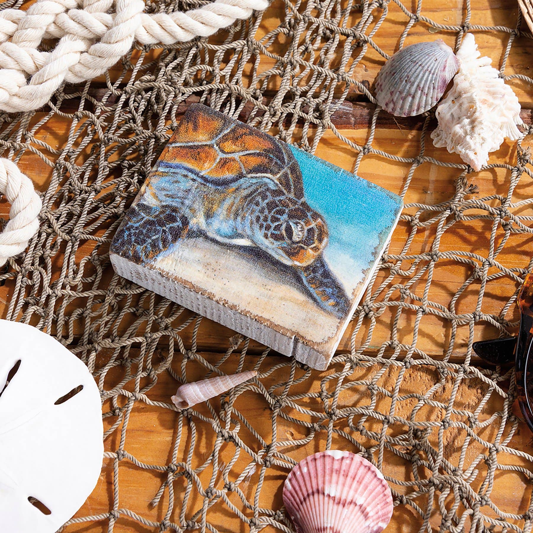 A wooden block sign depicting a sea turtle. Design is replicated from original artwork painted onto burlap canvas, giving the art a unique depth and texture. Easy to hang via predrilled keyhole slot or can free-stand alone.